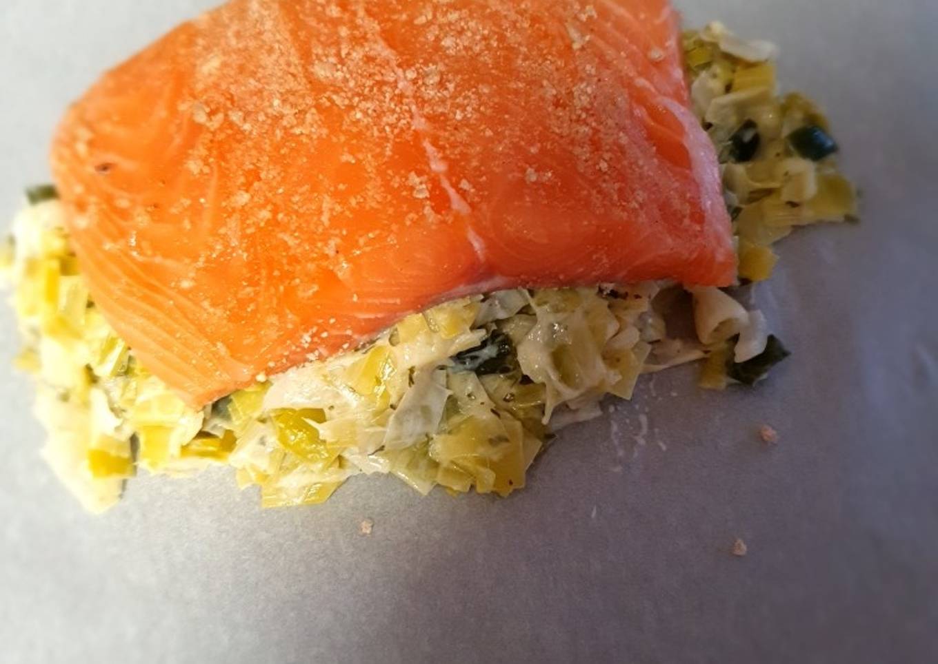 - Prendre une feuille de papier sulfurisé ou aluminium, dipose la fondue de poireaux, puis le filet de saumon dessus, rabattre le tout et disposer au four 20 à 25min.