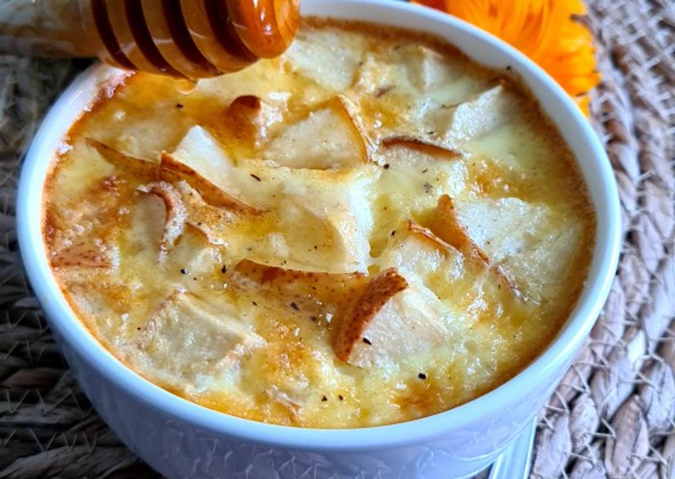 Rapide et facile à réaliser, ce flan de poires offre un savoureux petit-déjeuner.