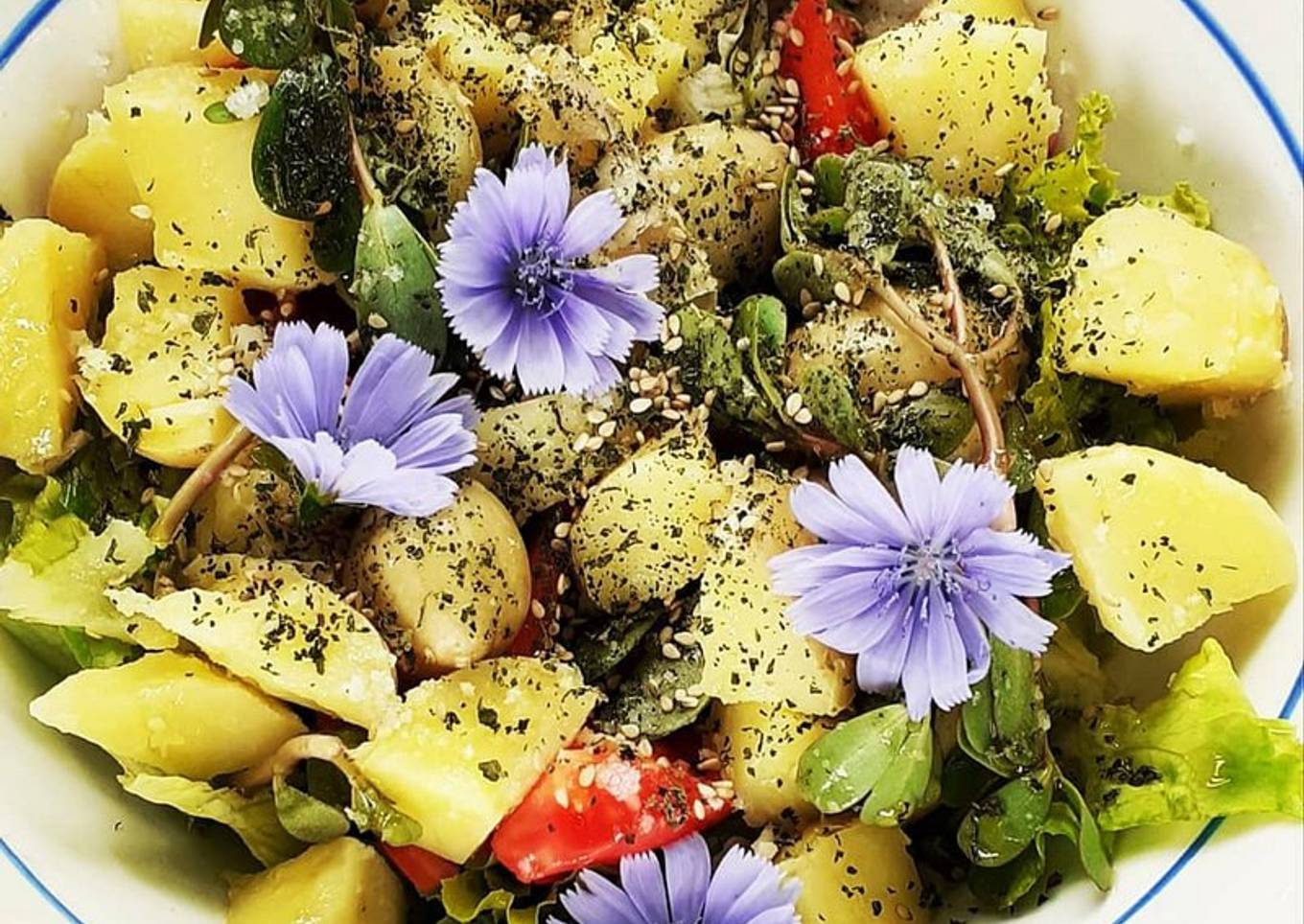 Retour du jardin avec cette salade aux pommes de terre nouvelles, pourpier et batavia que j'accompagnerai d'œufs mollets.