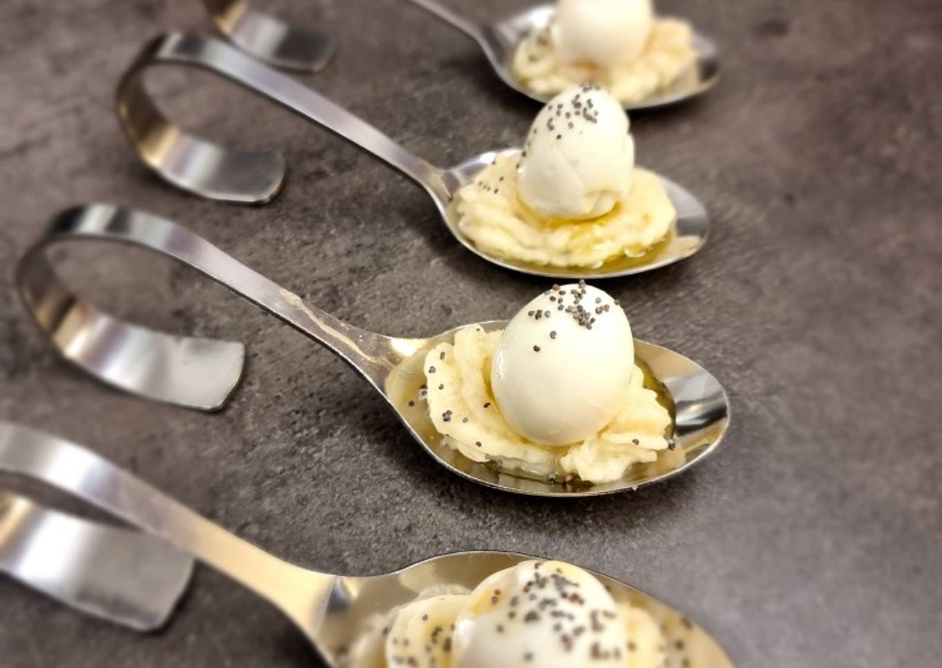 - Cuire les œufs de caille. Remplir une poche à douille de mousseline et mettre une noix dans chaque cuillère, puis un oeuf. Saupoudrez de fleur de sel et une goutte d'huile de truffe, decorez à votre convenance. Servir frais